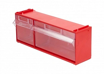 Короб откидной Стелла-техник F-300-2 (300х96х112мм.), красный, прозрачный служит для хранения мелкоштучных предметов. Данная система хранения не подвержена случайному опрокидыванию. Откидные удлиненная и стандартная ячейки обеспечивают быстрый доступ к необходимым предметам. В случае необходимости полного высыпания или наполнения внутренние ячейки легко извлекается. Полезный внутренний размер ячеек 184х65х70мм. и 88х65х70мм. Специальный пластик, из которого выполнен короб, выдерживает значительные нагрузки и обладает оптимальной эластичностью. На основе данных коробов можно сформировать многоярусную систему хранения, выстраивая вертикально. Данный короб, через отверстия на задней стенке, легко можно прикрепить к стене или установить на специальные кронштейны (Артикул: Кронштейны-FOX-750). Обзорность содержимого сквозь прозрачные внутренние ячейки, наличие отсека для информационных бирок, легкое извлечение внутреннего короба для опустошения и наполнения, все это является неоспоримым преимуществом откидных коробов серии F. Температура эксплуатации от -10 до +70С.