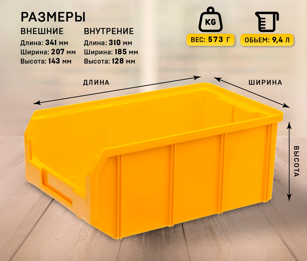 Пластиковый ящик V-3 (342х207х143мм.), широко применяется для организации мест хранения мелких деталей, различных комплектующих и запасных частей, различных узлов и агрегатов. Передняя стенка при помощи прозрачного ограничителя можно нарастить для увеличения объема ящика. Специальный карман на лицевой части позволяет размещать ярлык с описанием ассортимента хранящихся мелочей для более быстрого поиска необходимого контейнера. В сочетании с системами хранения серии V, пластиковые ящики организуют любое пространство, будь то гараж, магазин, автосервис или склад. Материал: ударопрочный полипропилен. Габаритные характеристики ящика V-3: длина 342мм., ширина 207мм., высота 143мм. Объем 9.4л. Температура эксплуатации от -20 до +70С.