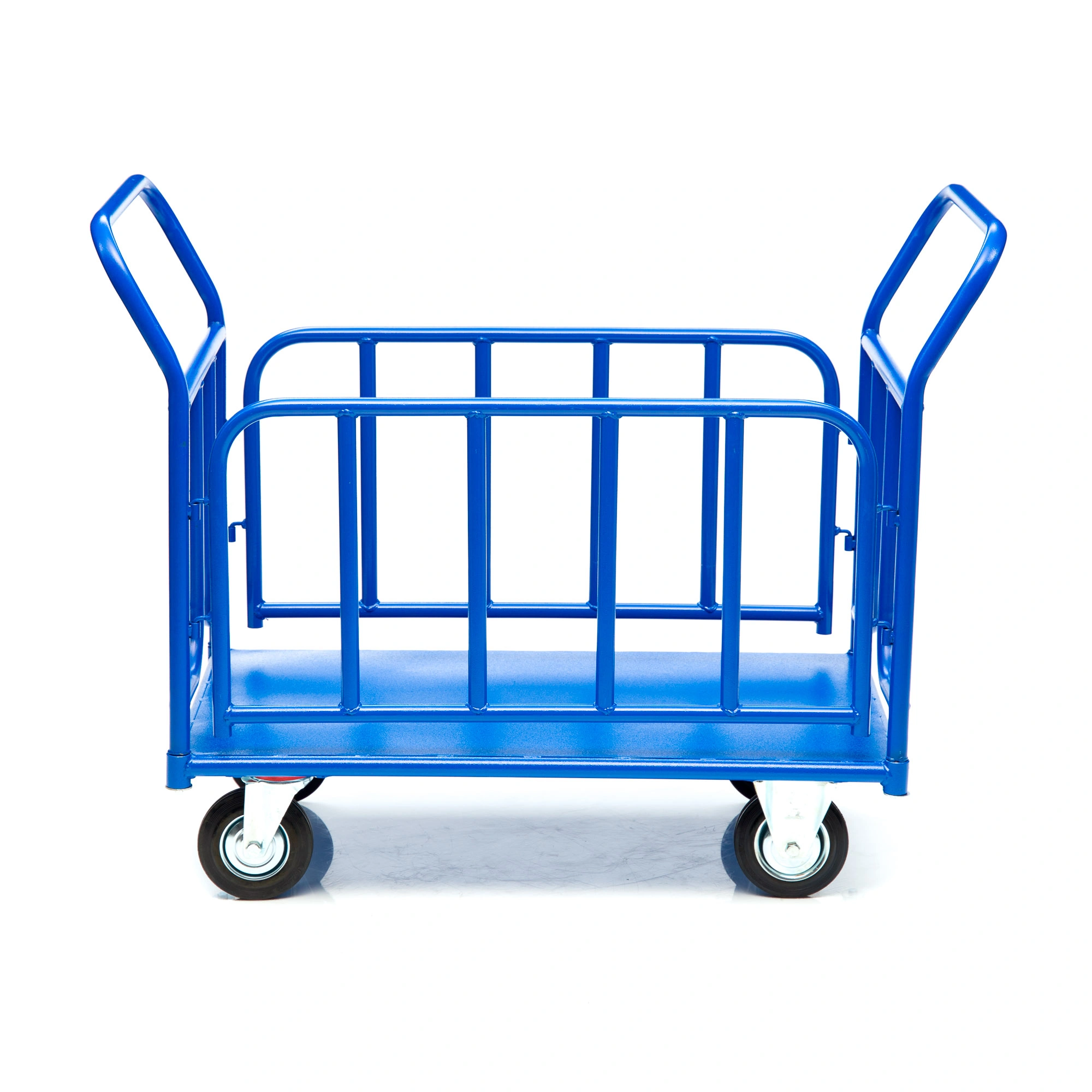 Платформенная 4-х колесная тележка с трубчатыми бортами КПО-300Т-200-К используется для транспортировки различных сборных грузов на оптовых базах и складах. Размер платформы 600х1000мм., Металлический борт груз от падения и ударов, что позволяет перевозить хрупкие предметы и сборные грузы. Ручки и борта тележки снимается для удобства транспортировки и компактного хранения. Высота боковых трубчатых бортов 400мм, высота борта от платформы 480мм., высота ручки 750мм., каркас платформы труба диаметром 28мм., настил металлический лист толщиной 1,2мм., ручка труба диаметром 28мм., толщина 1,5мм. каркас борта труба диаметром 25мм., толщина 1,5мм. Платформа имеет уникальную рельефную противоскользящую поверхность. Покрытие полимерное. Цвет - синий, шагрень. Для легкого перемещения тележка КПО-300Т-200-К комплектуется двумя поворотными и двумя неповоротными колесами, изготовленными из высококачественной литой резины, диаметром 200мм., комплектом крепежа. Грузоподъемность до 550кг.